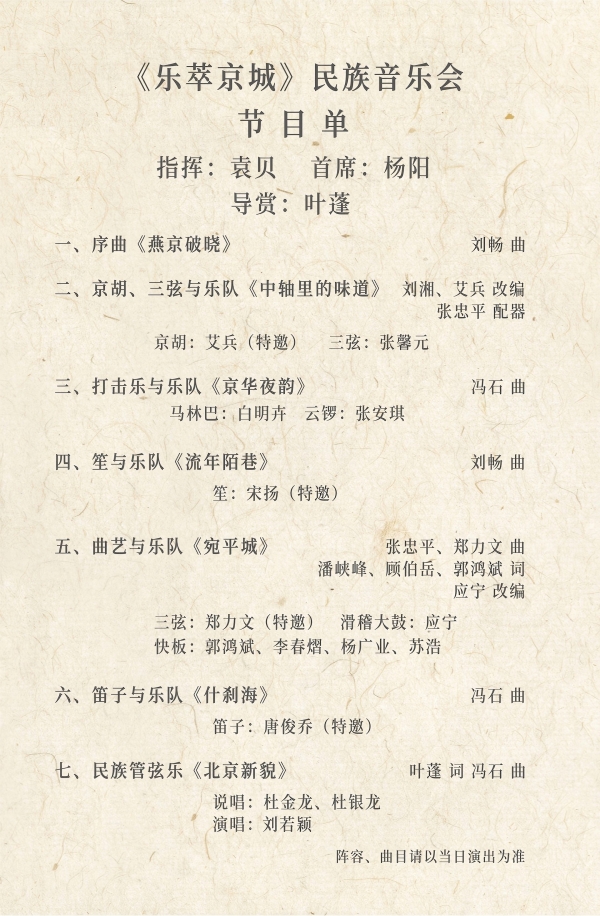 除了匠心独运的曲目设计,本场音乐会更汇聚了一支实力雄厚的演奏家与艺术家阵容,他们将用手中的乐器与动人的表演,带领观众走进一场穿越古今的北京音乐之旅。