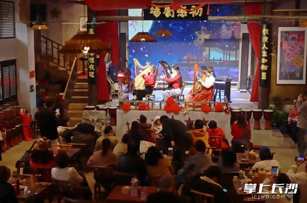 下午2时,茶馆主厅座无虚席。箜篌声起,空灵清越,如清泉流淌。这件曾在敦煌壁画中出现两百余次、绝响数百年的古老乐器,让在场游客听得入神,来自雨花区的杨女士说:“像风吹过屋后竹林。”