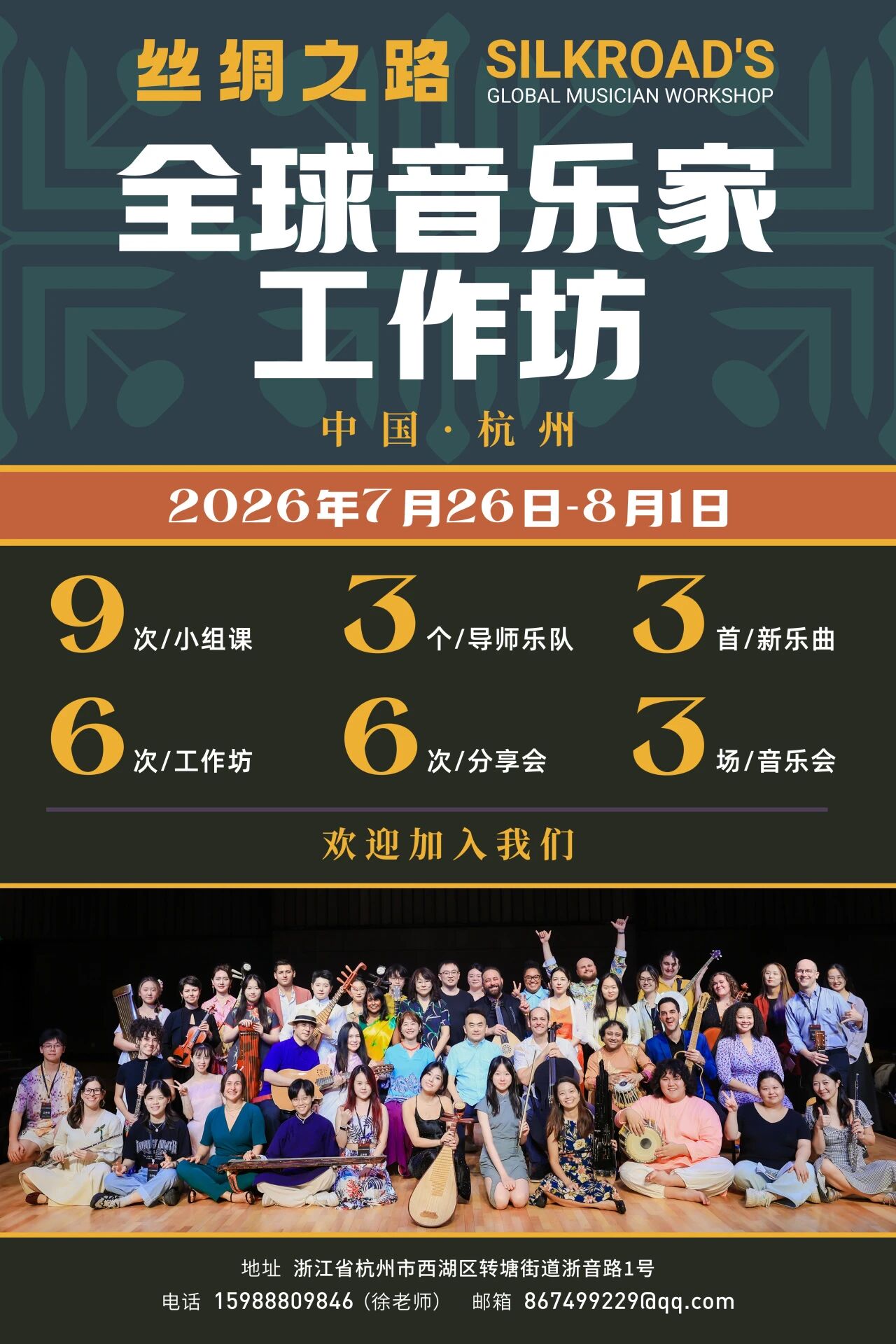 由浙江音乐学院、美国丝绸之路乐团主办,浙音国际交流合作处(港澳台事务办公室)、浙音人才办、浙音国乐系、丝绸之路表演艺术中心、浙音乐典文化承办,浙音教培、浙音演艺、浙音文交协办的第三届 “丝绸之路”全球音乐家工作坊将于2026年7月26—8月1日在浙江音乐学院举行。本次活动将汇聚来自全球各地的优秀演奏(唱)家,以音乐为桥梁,学习和探究来自国内外高品质、跨文化、多元化的文化和艺术思维。
