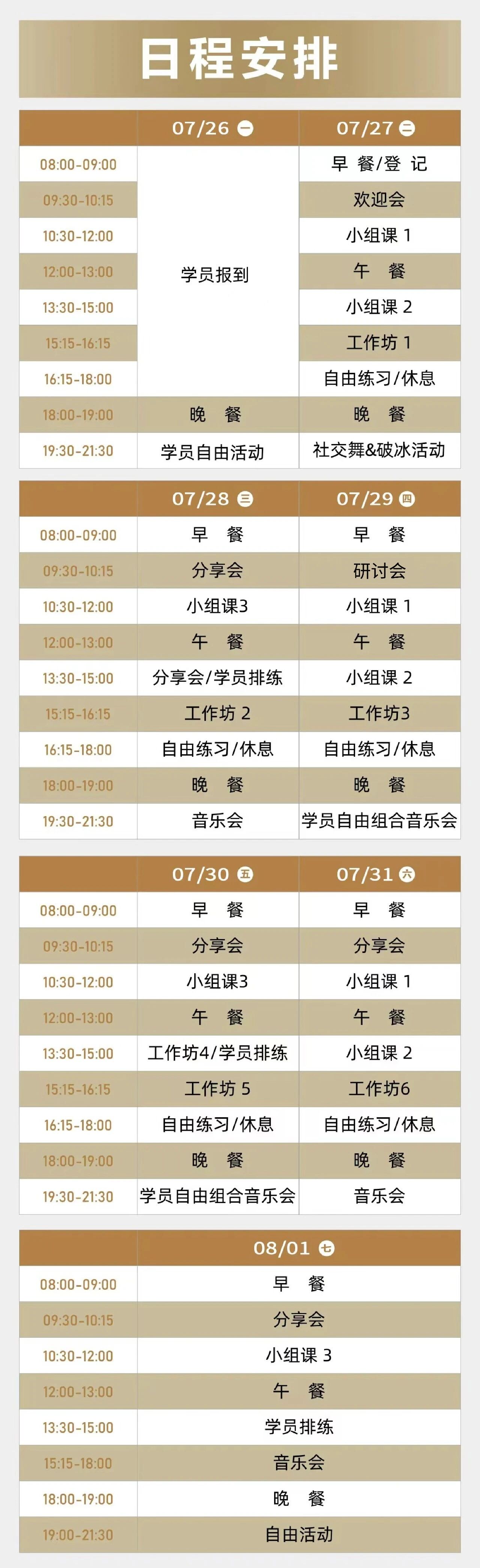 包含活动期间的食宿和9次小组课、3个不同导师的小乐队、学习至少3首新乐曲、5位导师分享会、5位导师特色音乐工作坊、1场导师专场音乐会、3次音乐会和即兴演奏活动。