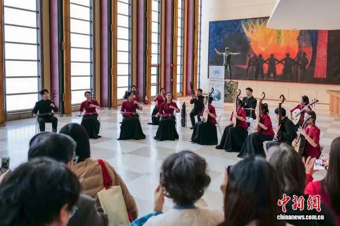 当地时间2月25日,来自中国最高音乐学府中央音乐学院的民乐师生在纽约联合国总部上演“快闪”音乐会,向世界传递新春祝福。本次“快闪”音乐会由中国文联、中国音协、中央音乐学院、联合国妇女协会共同举办,旨在让更多人关注妇女与儿童议题。当天,17位音乐家带来作品《喜相逢》《天山之春》《彝族舞曲》《良宵》《赛马》《牧童短笛》《雪绒花》《花好月圆》,其中《牧童短笛》《雪绒花》为专为儿童选曲。联合国各国工作人员、外交官及游客驻足聆听音乐会,并在结束后与音乐家们进行了交流。