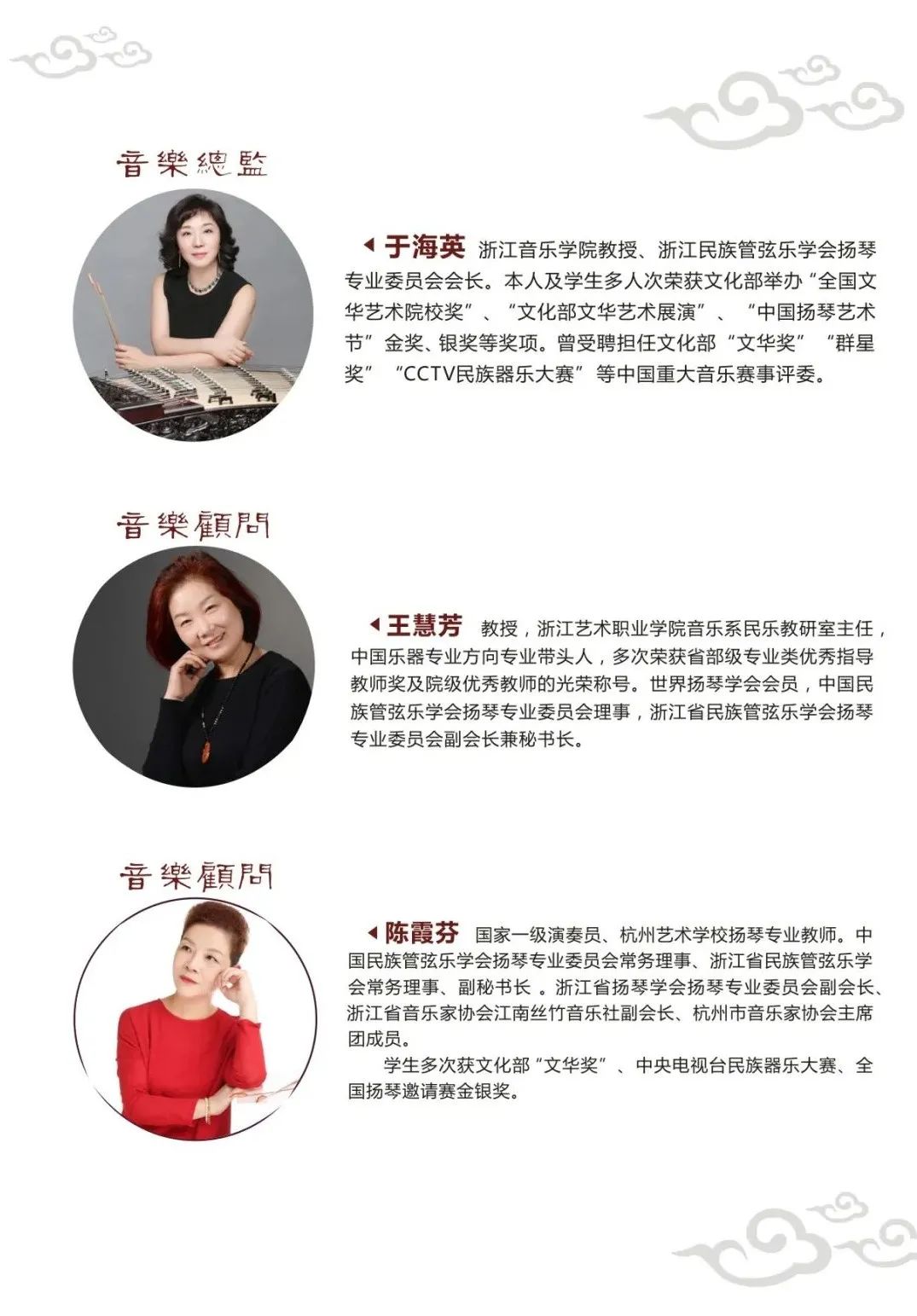 第十五届世界扬琴大会——浙江扬琴专场音乐会由浙江音乐学院、浙江艺术职业学院、杭州艺术学校、浙江省歌剧舞剧院等共九个单位组成,其中于海英担任音乐总监,王慧芳、陈霞芬担任音乐顾问。