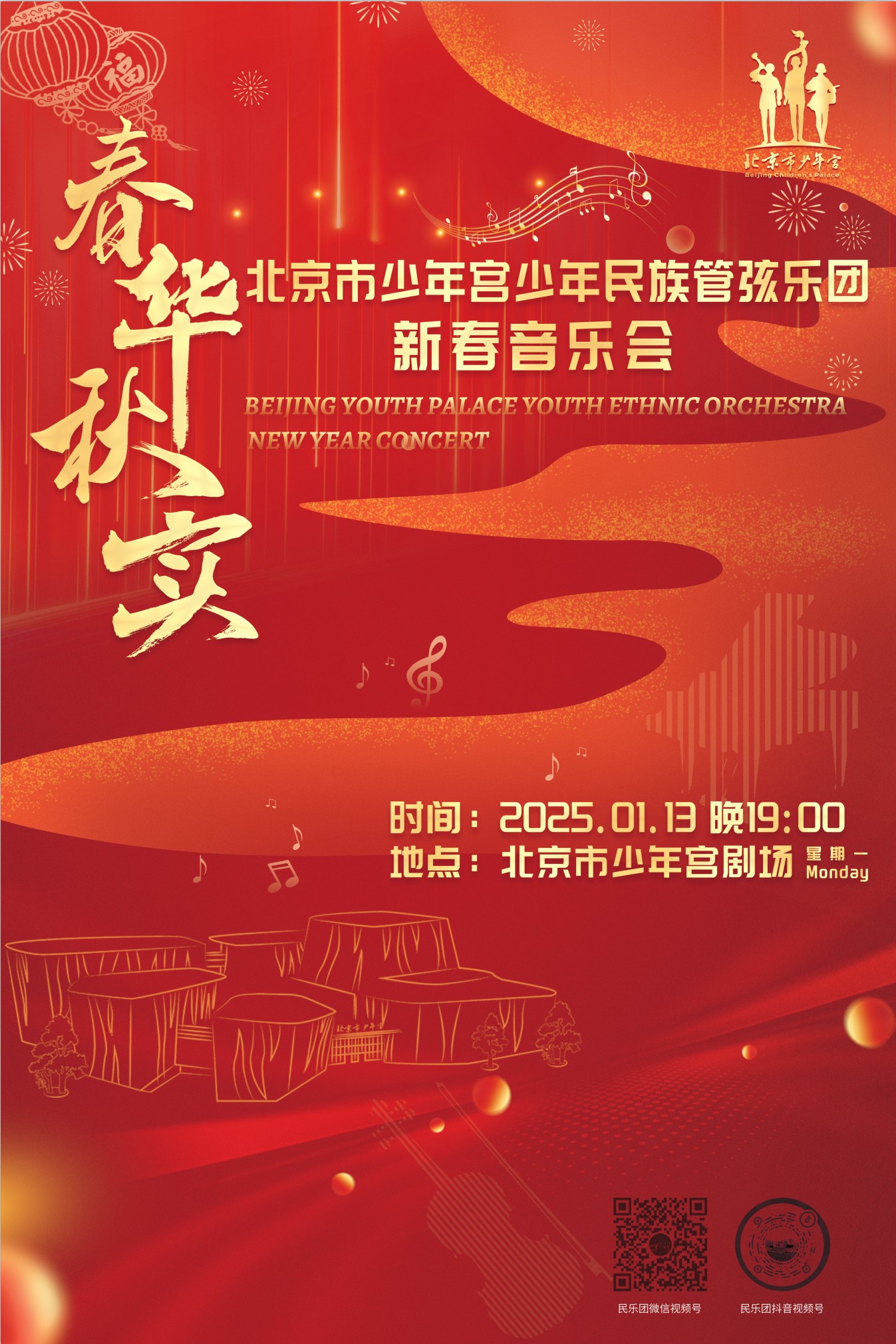 北京市少年宫是北京市委教育工委市教委所属公益一类事业单位,是北京唯一一家市级校外教育机构。北京市少年宫坚持以习近平新时代中国特色社会主义思想为指导,以实现习近平总书记提出的“让孩子们成长得更好”为目标而努力奋斗。北京市少年宫民族管弦乐团的前身是成立于二十世纪五十年代的北京市少年宫民乐队,乐队多年来一直是市少年宫对外宣传的窗口,为中国民乐界培养了大批优秀人才。新宫迁址后,民乐队于2019年初重新组建,并于2023年正式成立并改名为北京市少年宫民族管弦乐团。2025年对于北京市少年宫来说是一个特别的年份,少年宫即将迎来建宫70周年,民乐团作为少年宫硕硕果实中的一颗,将用本场音乐会表达对北京市少年宫的热爱和感恩之情。音乐会包含民乐团和小型室内乐队两种演出形式,并与合唱、声乐表演唱等项目进行融合创新演出,期待给孩子们不同的艺术体验,给观众们呈现更全面的舞台体验。