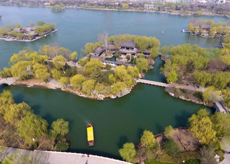 2.漫步湖边,杨柳依依,湖光粼粼,水天山色。