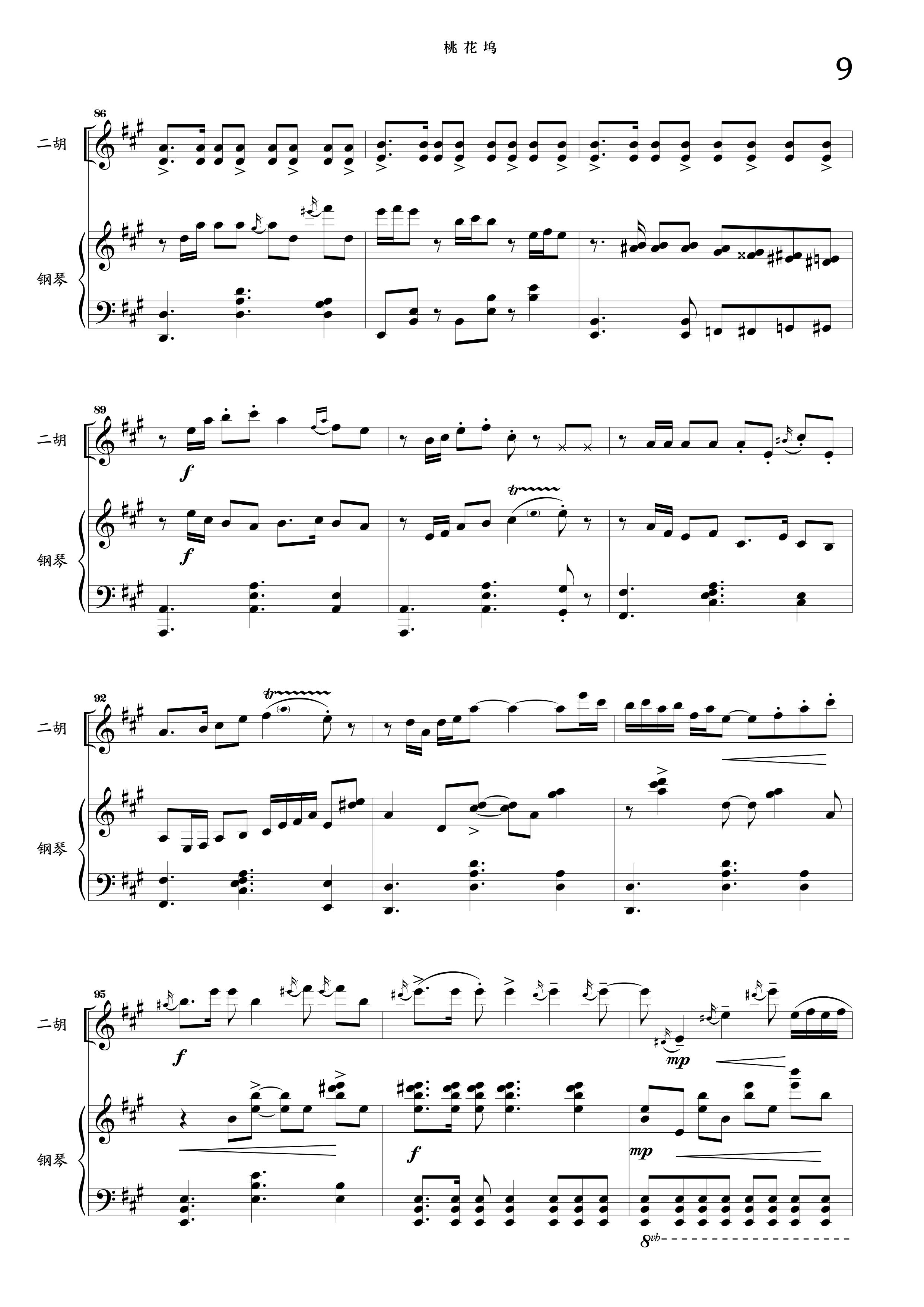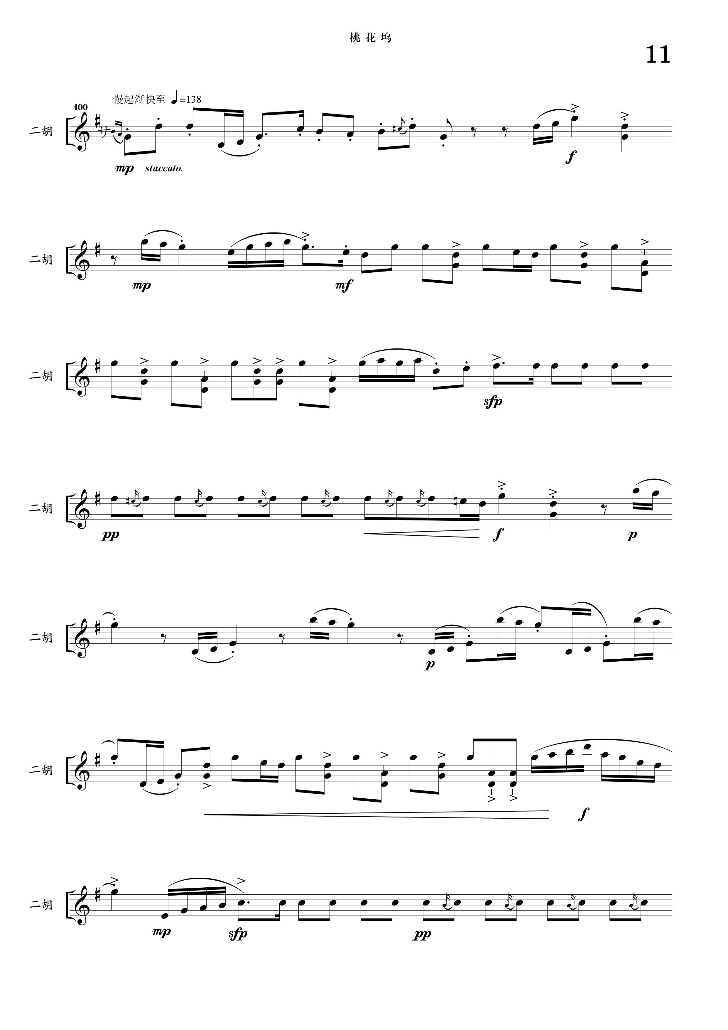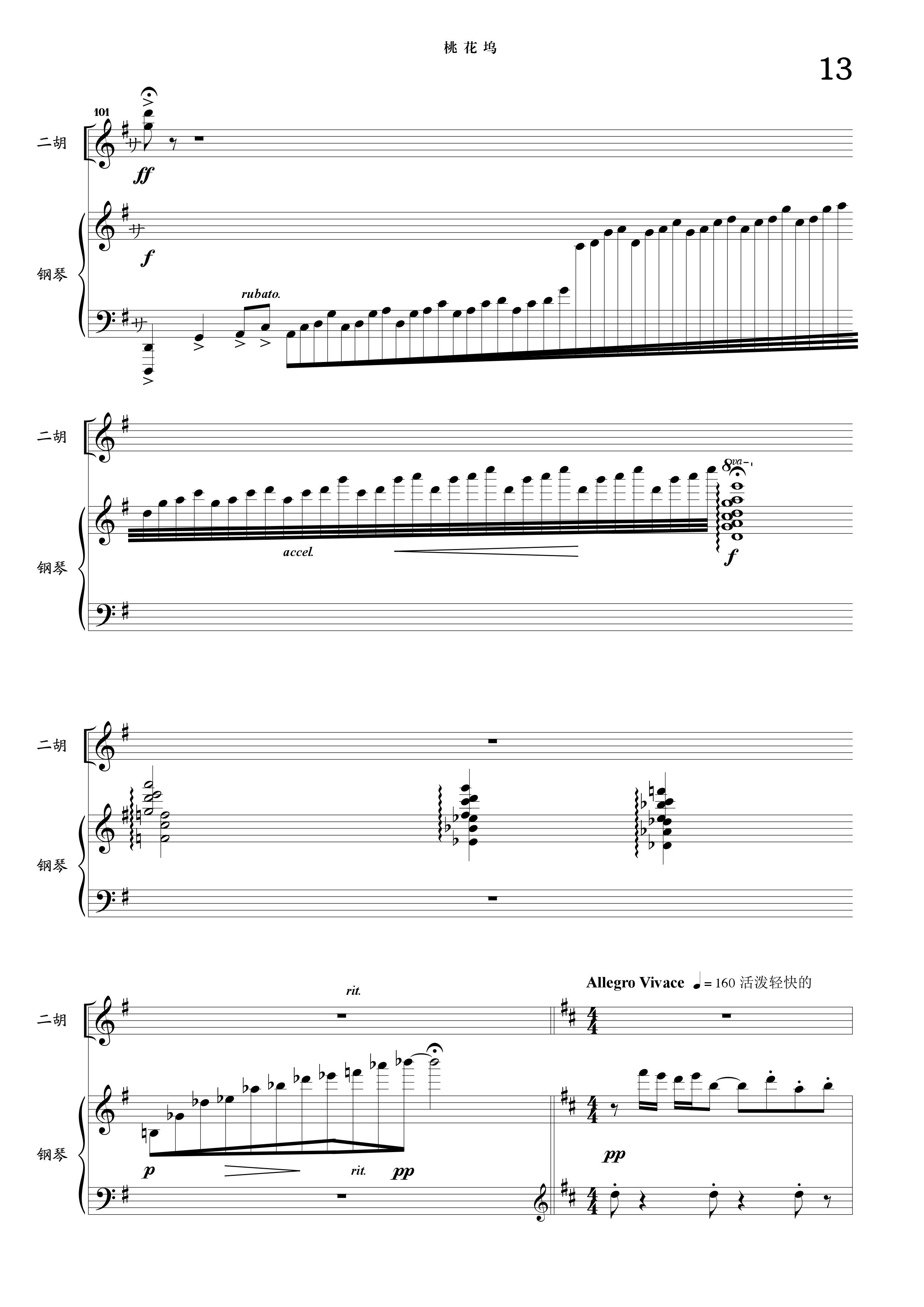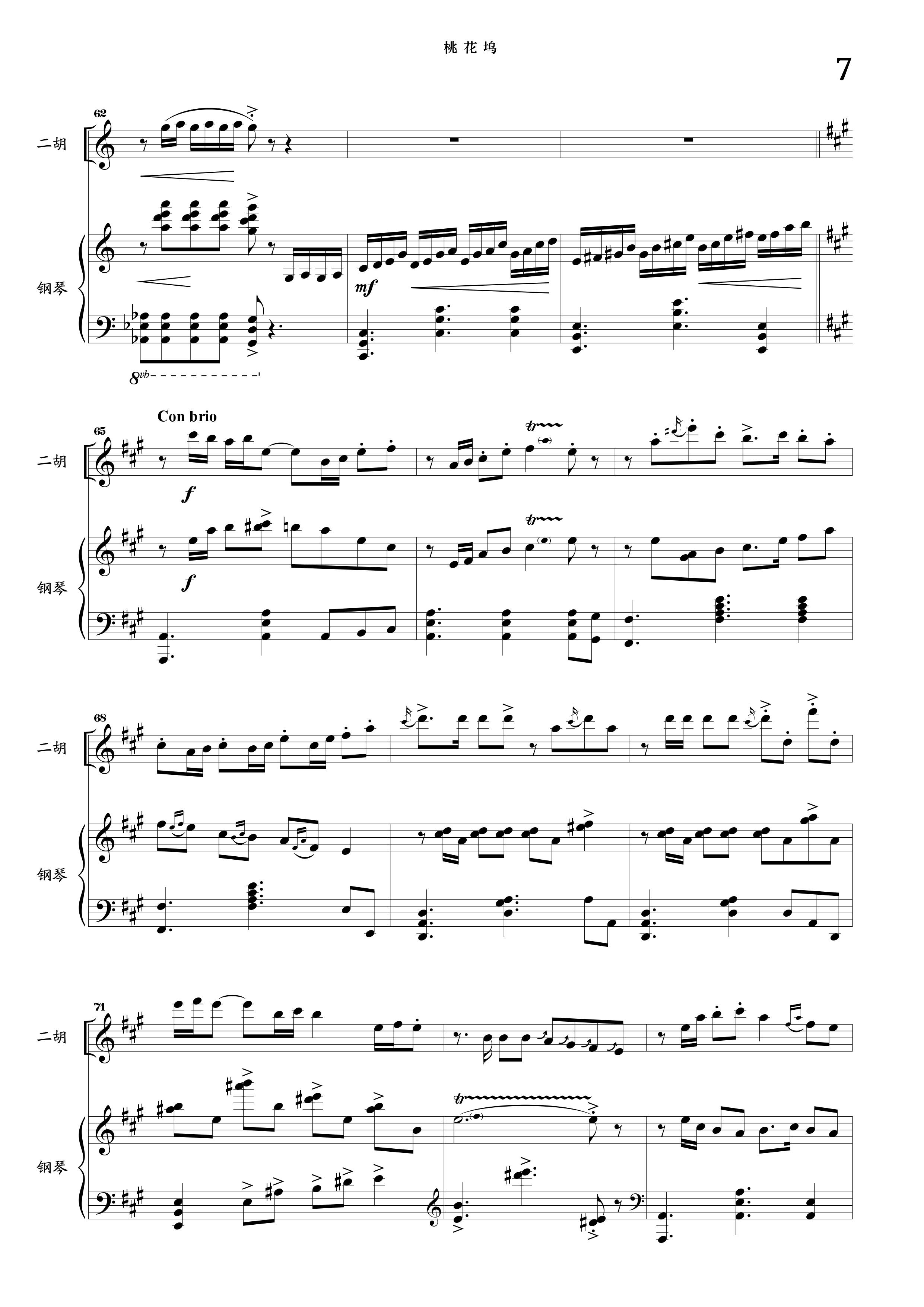 第三段是较为急促的快板,表现了车水马龙、热闹繁华的桃花坞街市场景,再现第一段的主题素材,以转调、加花、复调的形式进行发展变化并推至高潮后结束。