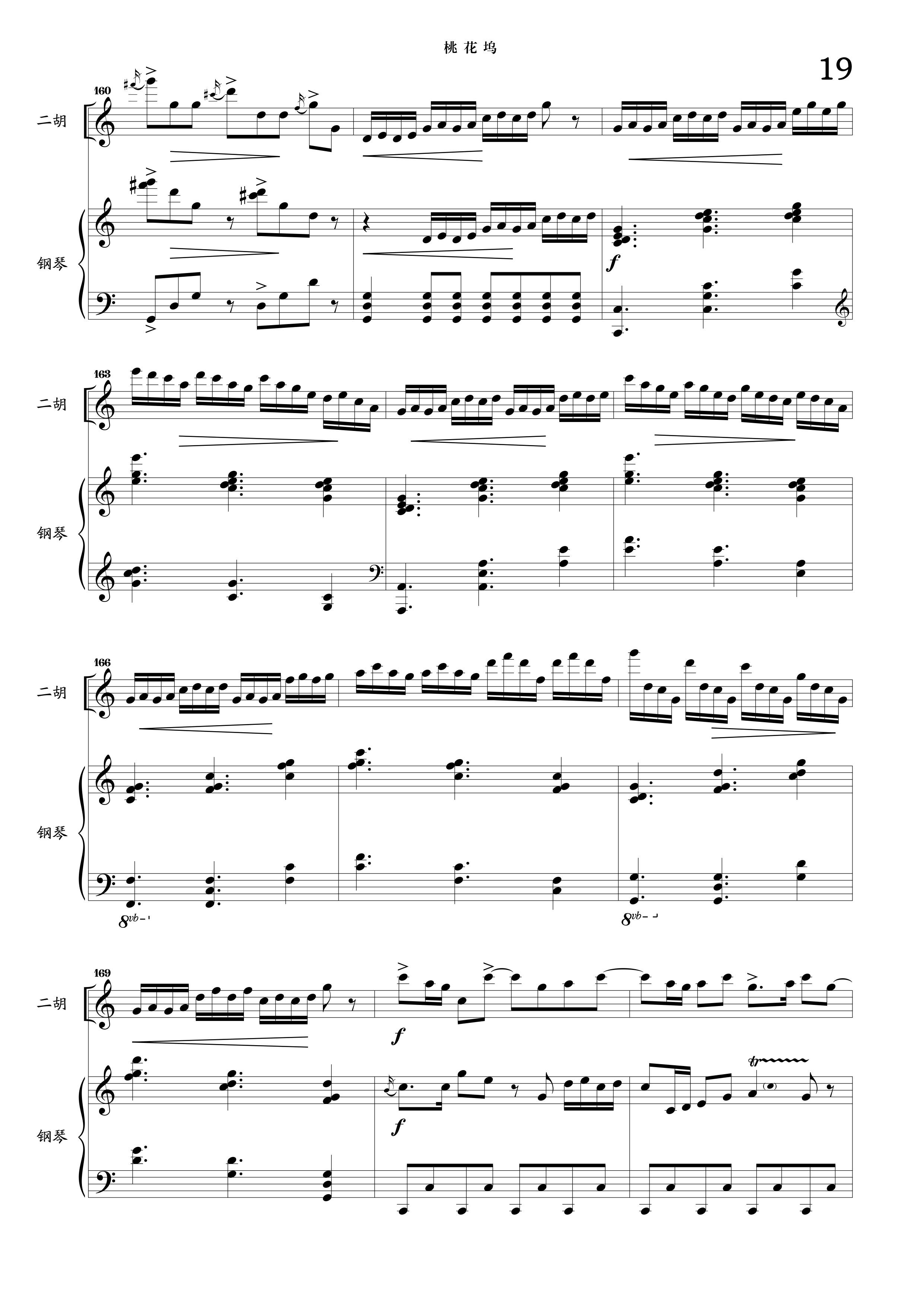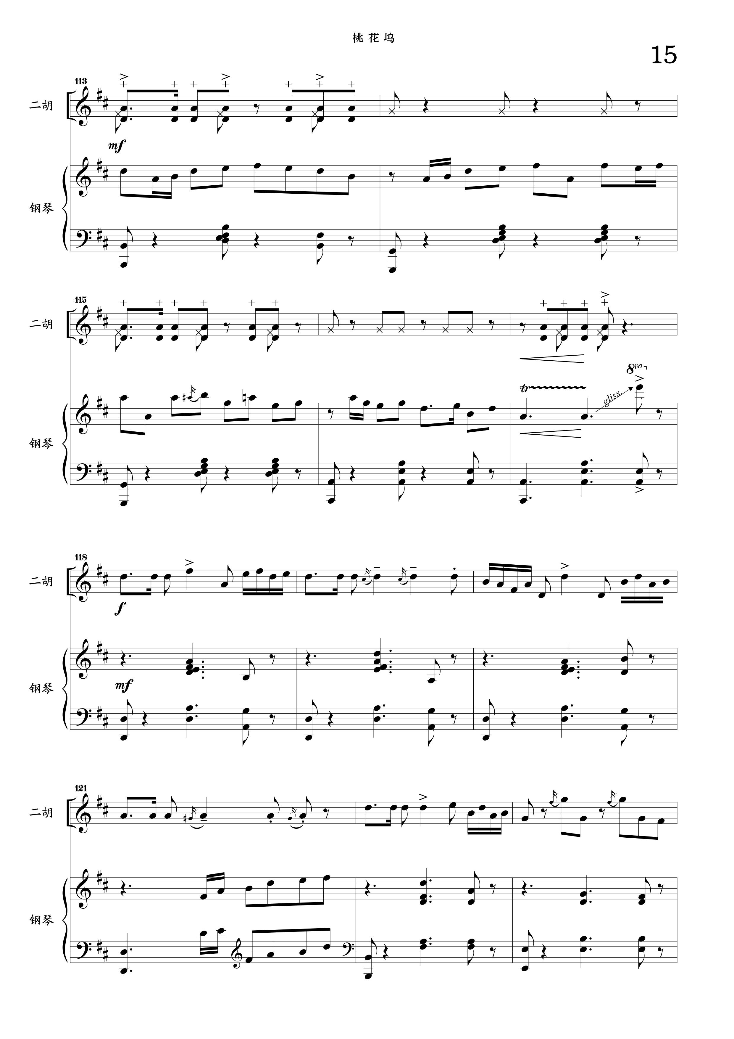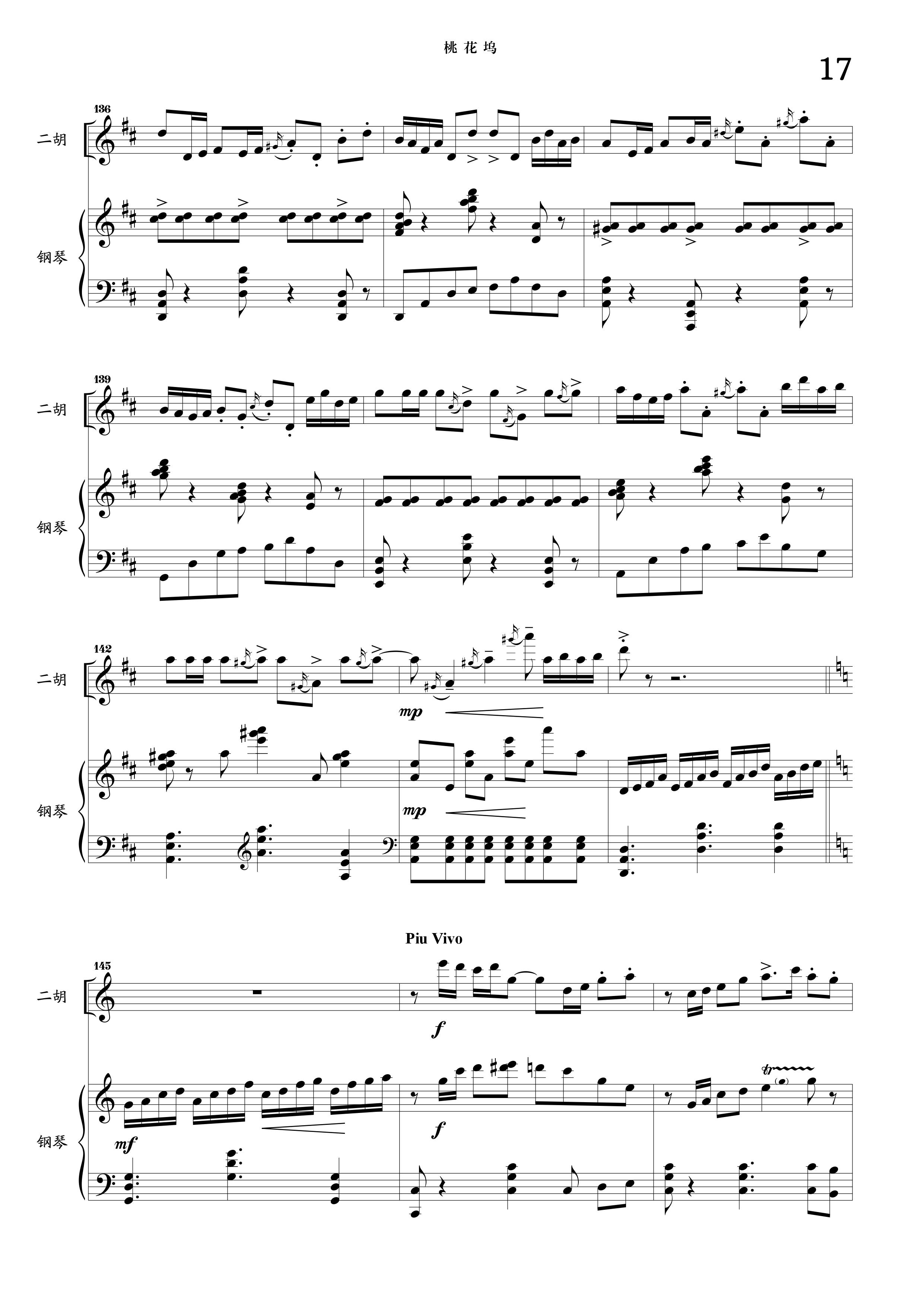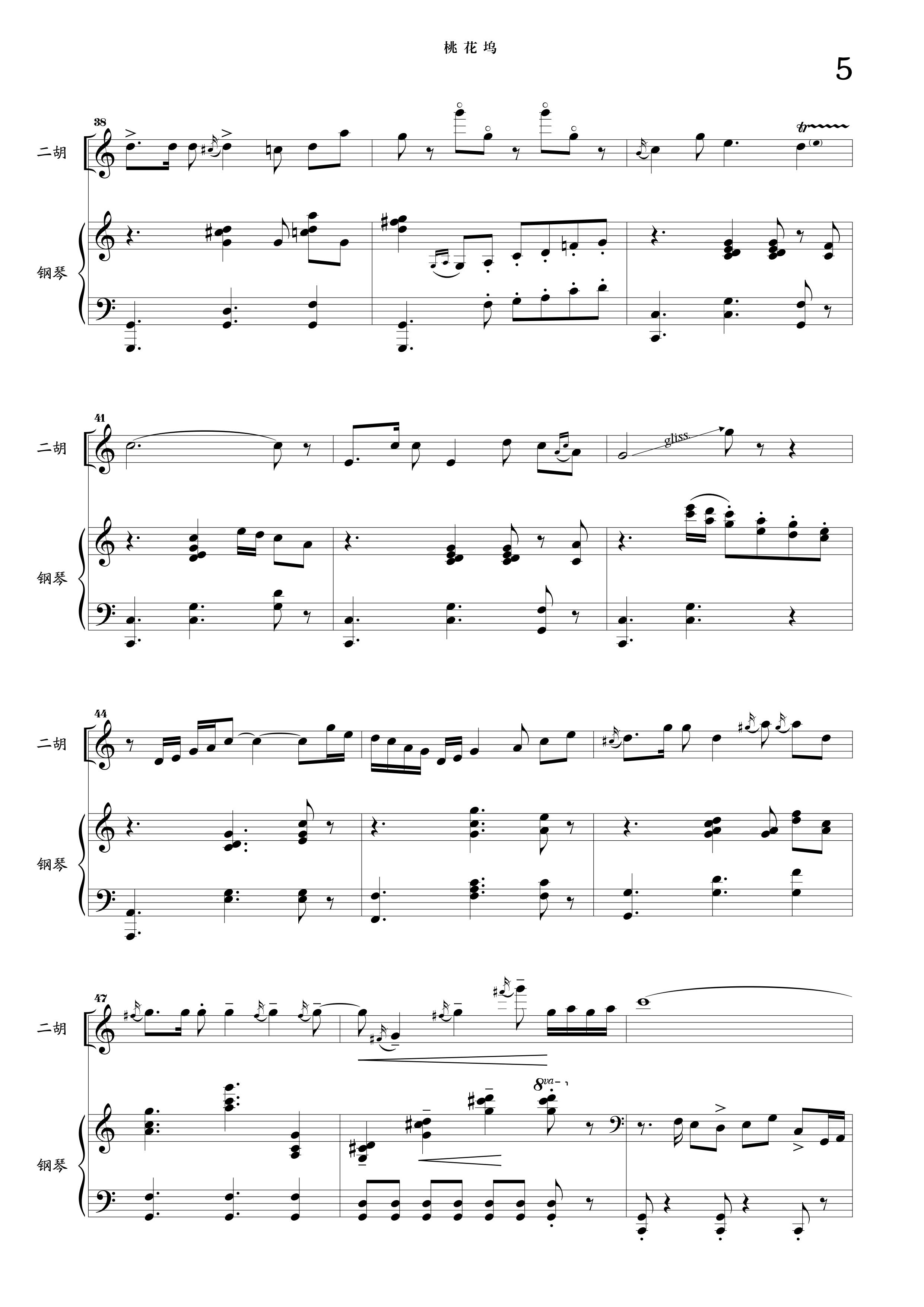 第三段是较为急促的快板,表现了车水马龙、热闹繁华的桃花坞街市场景,再现第一段的主题素材,以转调、加花、复调的形式进行发展变化并推至高潮后结束。