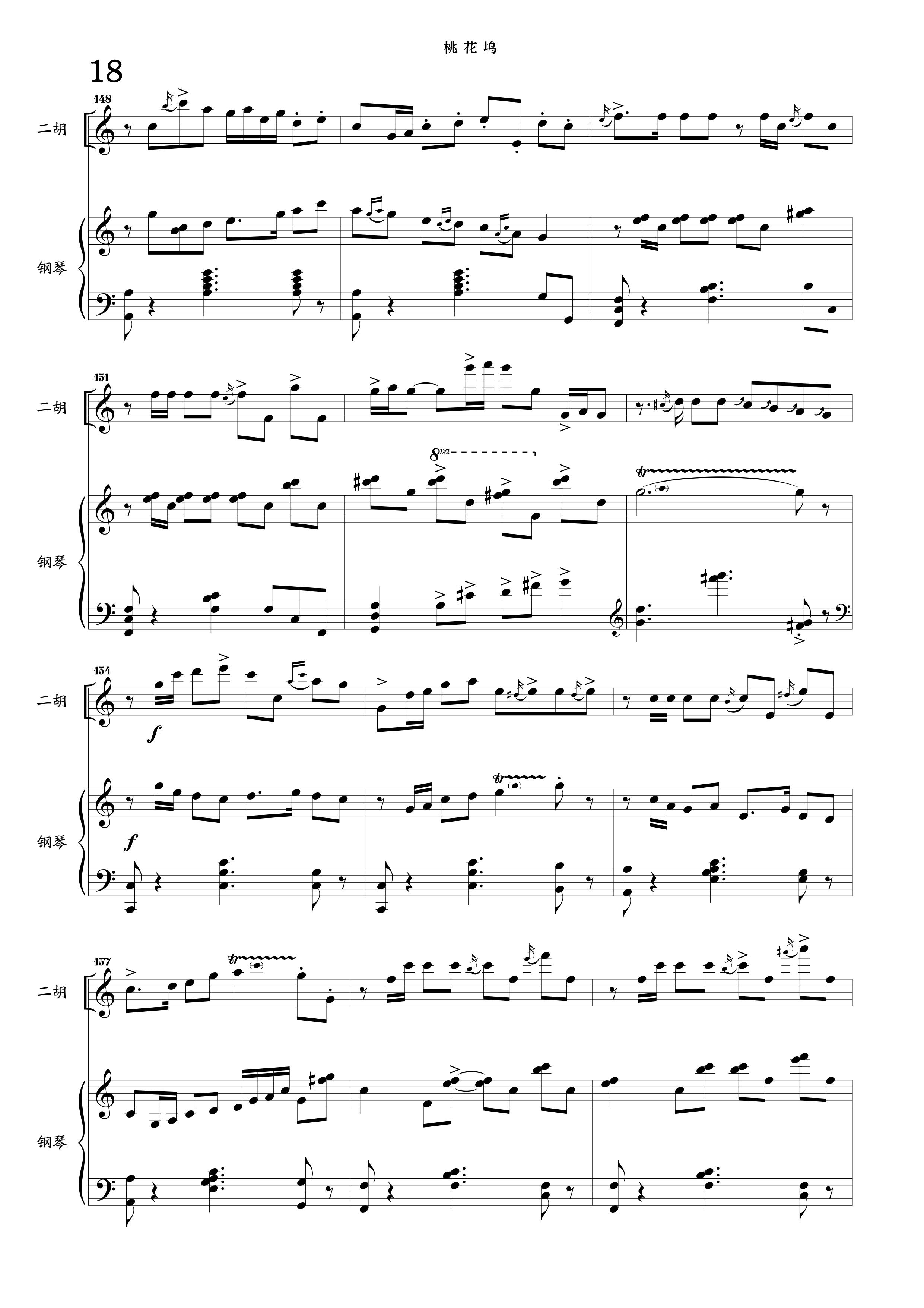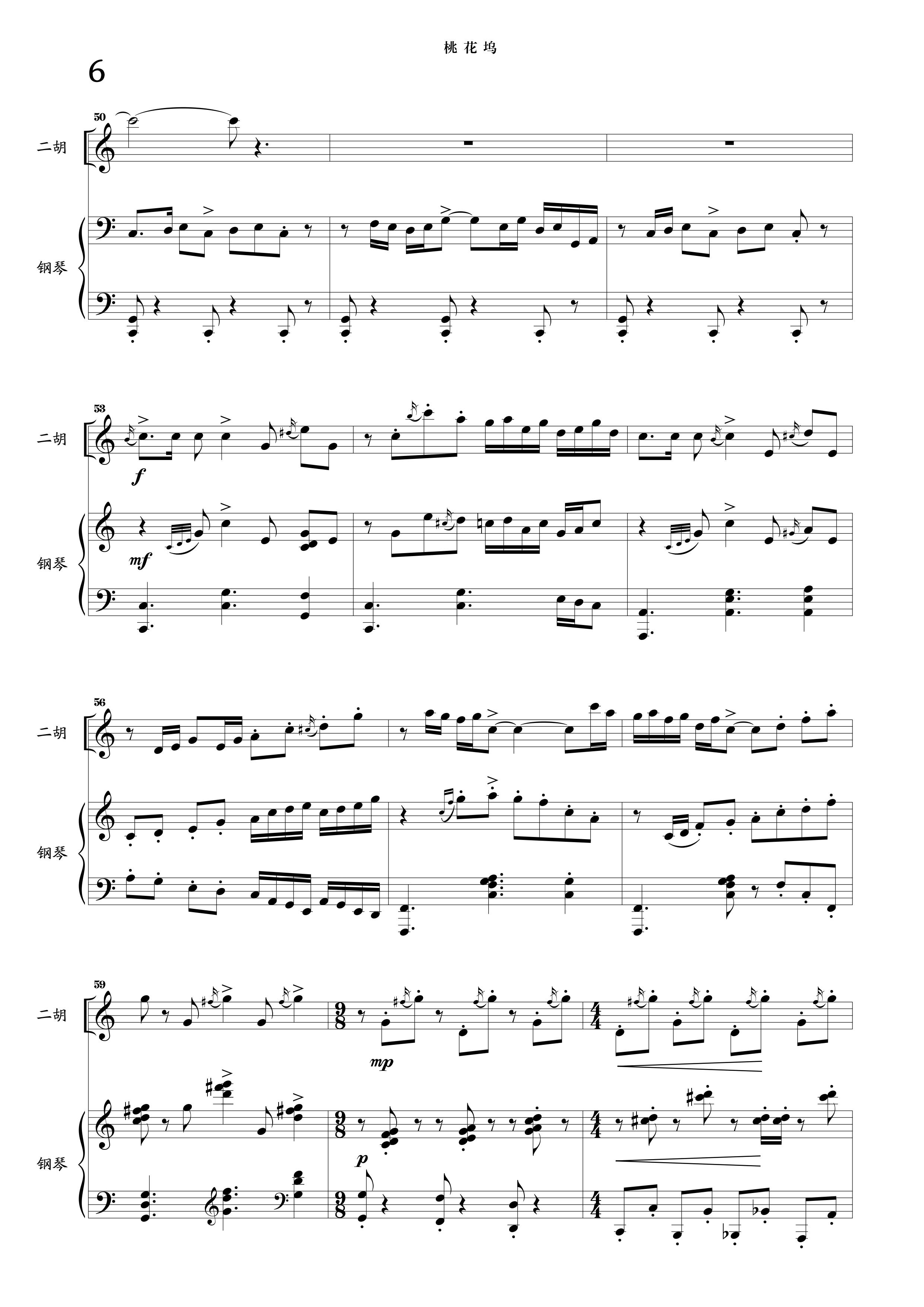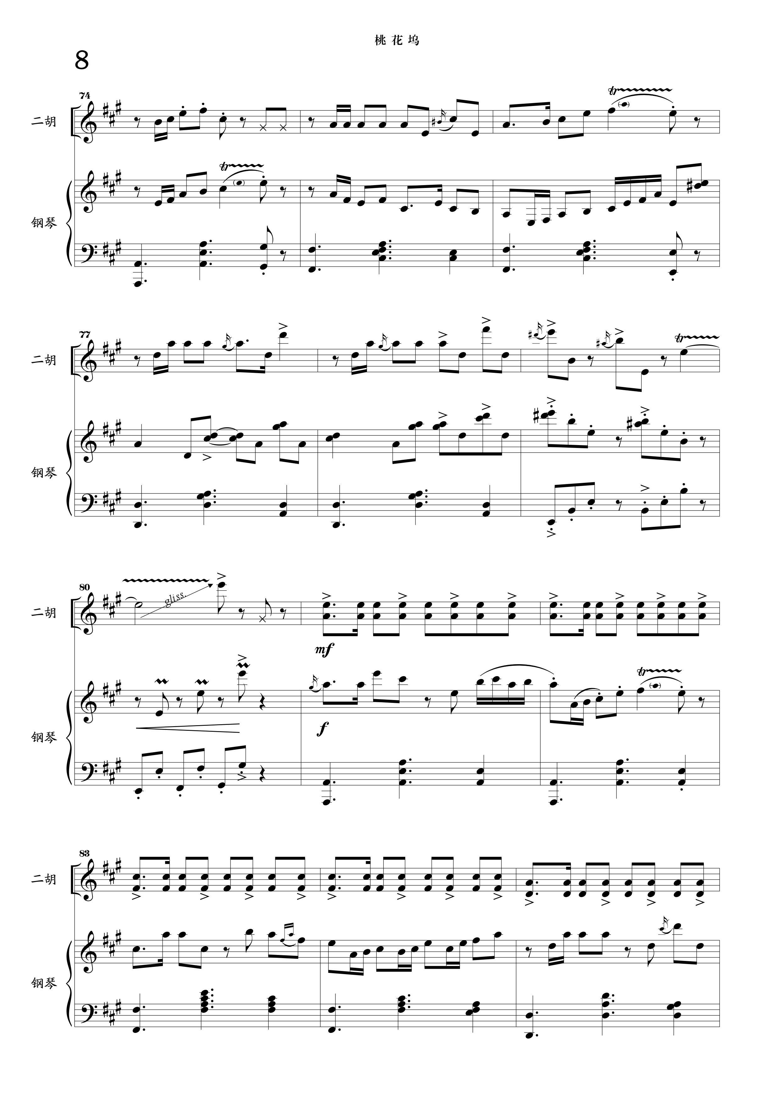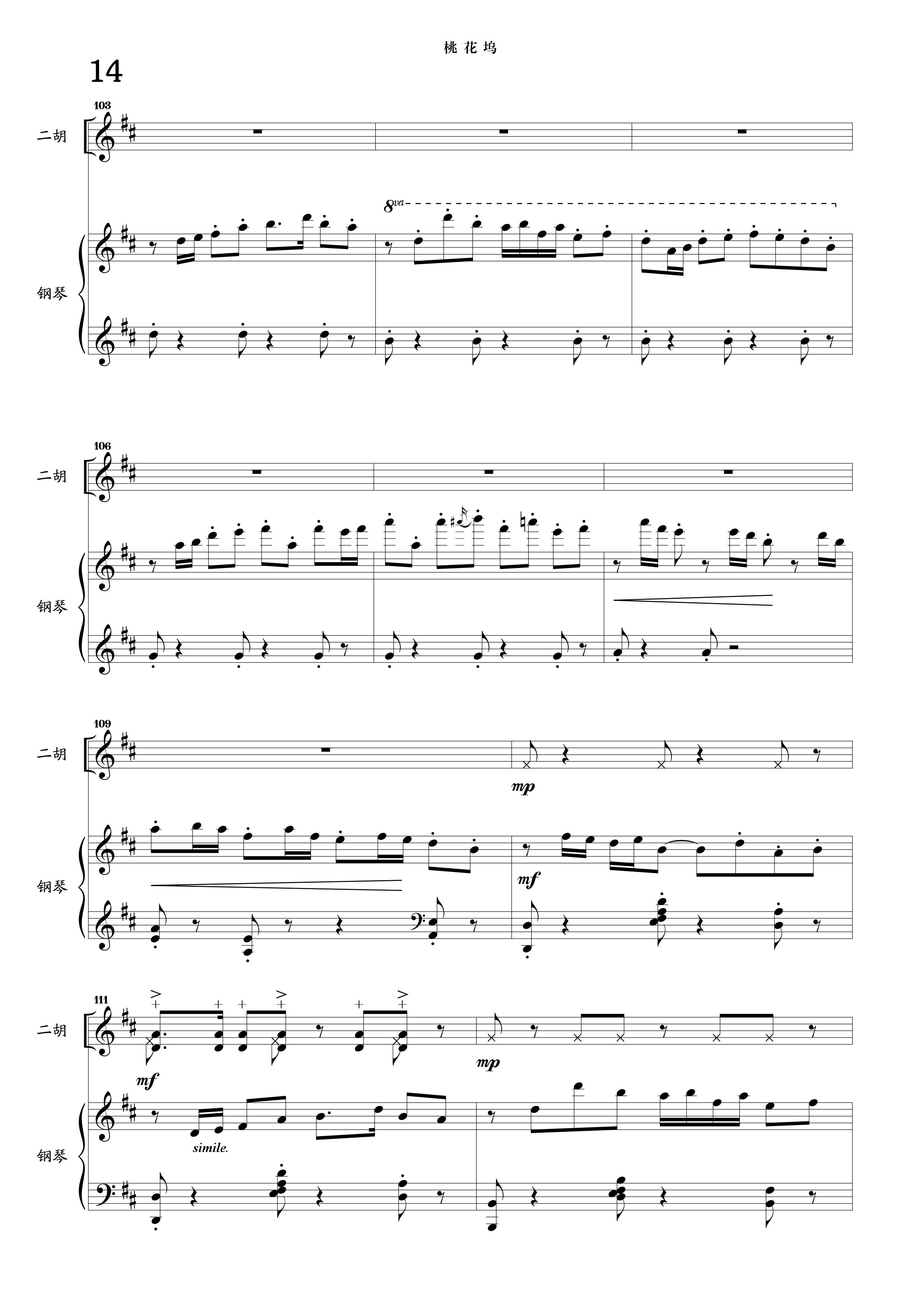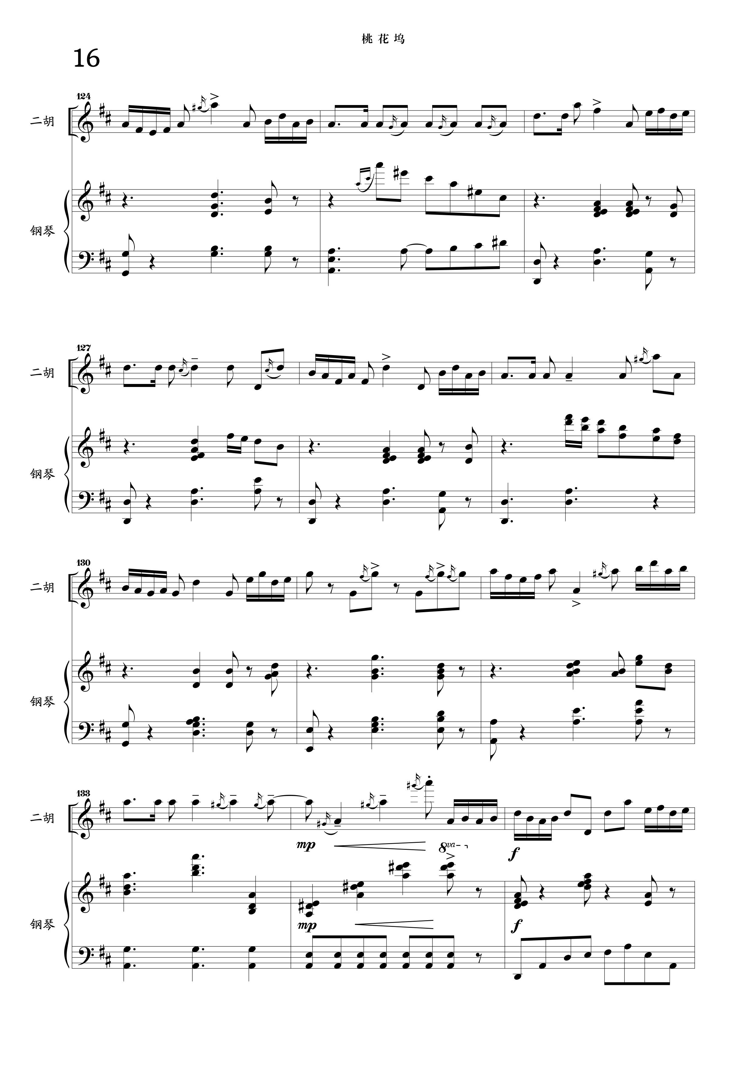 第三段是较为急促的快板,表现了车水马龙、热闹繁华的桃花坞街市场景,再现第一段的主题素材,以转调、加花、复调的形式进行发展变化并推至高潮后结束。