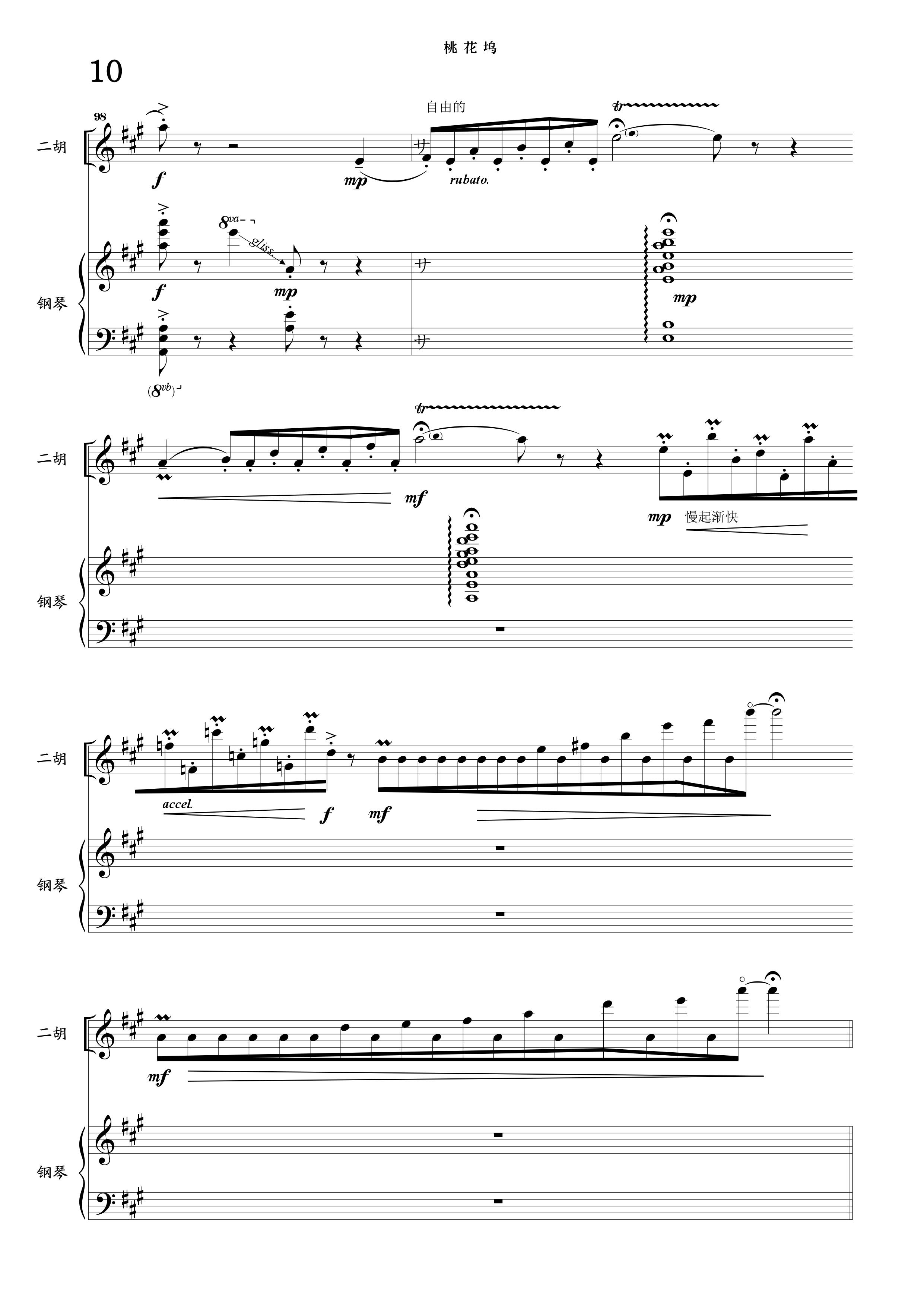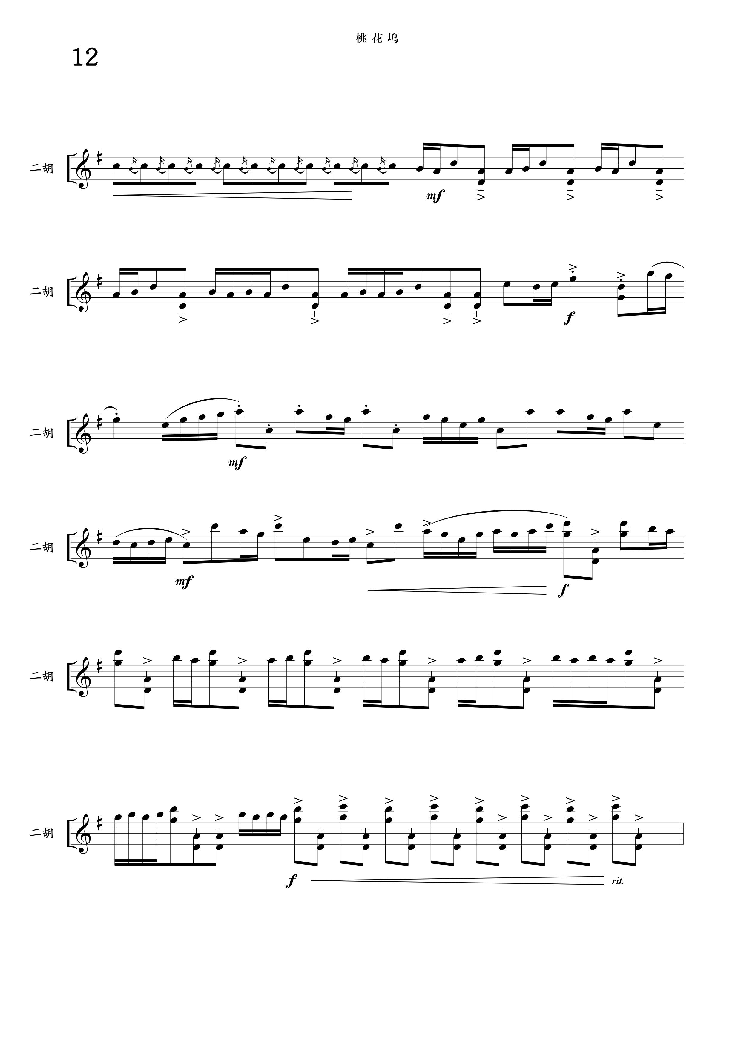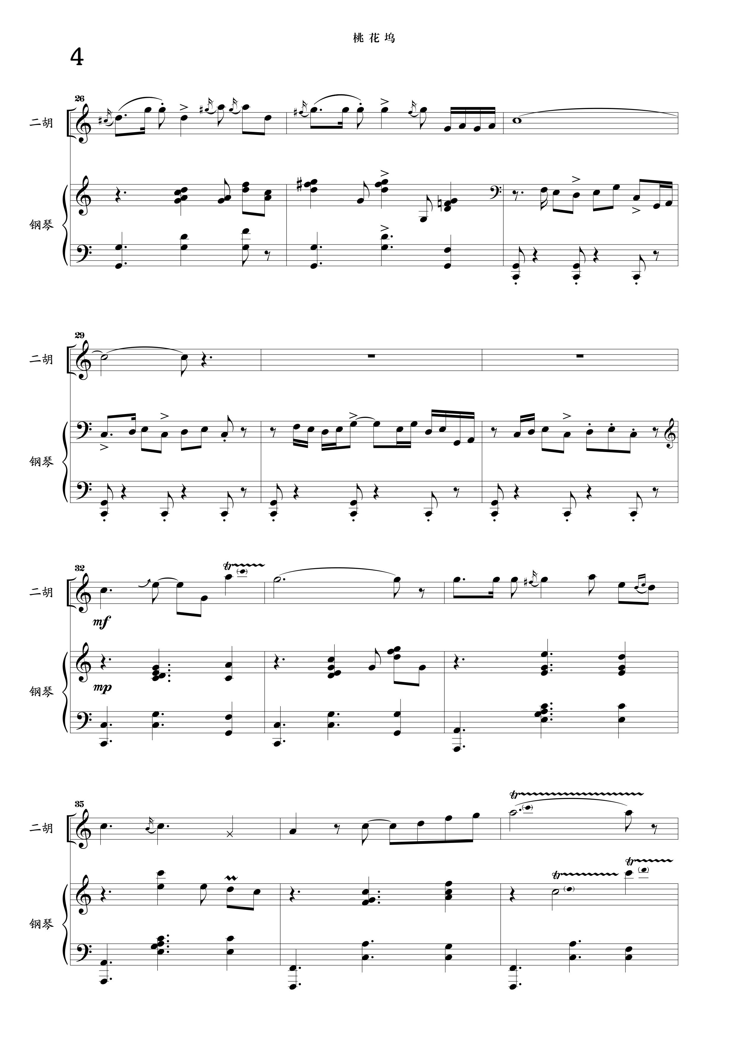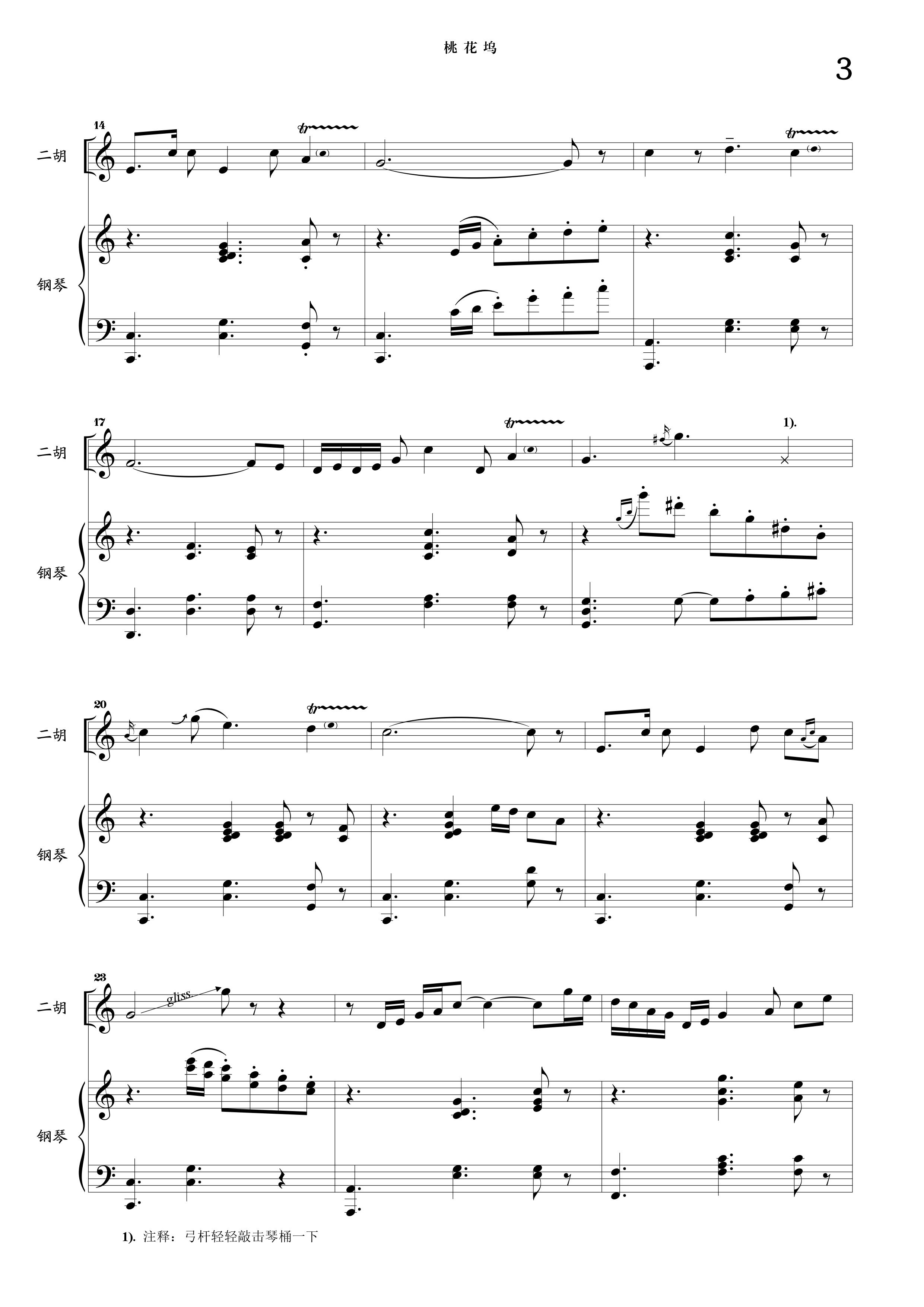 第三段是较为急促的快板,表现了车水马龙、热闹繁华的桃花坞街市场景,再现第一段的主题素材,以转调、加花、复调的形式进行发展变化并推至高潮后结束。