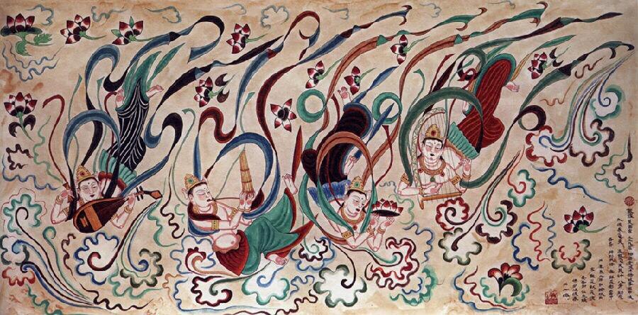 伎乐天是佛教中的香音之神,在敦煌壁画中,伎乐天亦指天宫奏乐的乐伎,就是人们常说的“飞天”。音乐描绘了敦煌壁画上飞天的婀娜身姿,曲调采用了西域音乐风格,神秘而灵动,充分发挥了箜篌善于表达旋律性作品的特点。
